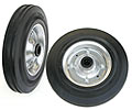 Reifen aus Vollgummi schwarz (Härte 85º Shore A), temperaturbeständig von -20°C bis +60°C, Felge aus Stahlblech mit Rollenlager-Nabe, Radgrößen von 80mm bis 400mm Durchmesser, Tragkraft von 50kg bei dem 80mm Rad bis 475kg bei dem 400mm Rad. |